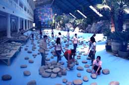 由中外合資投建的北京蟹島趕海宮7月1日建成,只等灌入海水。蟹島趕海宮建筑面積20000平方米,將引進純海水4000立方,純海沙1000立方,利用太陽能打造綠色環(huán)保建筑,實行高科技全自動化水循環(huán)凈化系統(tǒng)。為喜愛海水的游人提供旅游休閑的一處勝地。圖為工作人員在北京蟹島趕海宮布置“海底”。