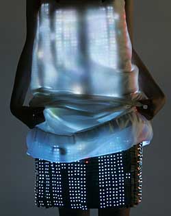 | 在日本首都東京,一名模特展示一條發(fā)光的裙子。新華社/路透 | 服裝向來被用來保護(hù)人體不受外部環(huán)境影響或維持人們的良好形象。然而,在美國加州圣迭戈舉行的2007年計(jì)算機(jī)圖形學(xué)年會(huì)“未來服裝展”卻讓人大跌眼鏡。因?yàn)槲磥淼姆b不再是傳統(tǒng)意義上的“人體保護(hù)層”,而是融合高端技術(shù)的智能服裝。 據(jù)英國《衛(wèi)報(bào)》報(bào)道,智能服裝就是裝有電子配件和微型電腦的服裝,在人們?nèi)粘I钪心芷鸬捷o助作用。有的智能服裝可以給音樂播放器充電,有的可以傳遞秘密信息,有的能發(fā)光,還有的可操縱電腦游戲。 美國紐約大學(xué)的安德魯·施奈德發(fā)明出一款“太陽能比基尼”。這款泳裝上分布了40個(gè)可變形光電電池,用來給USB接口充電。如果把shuffle款的iPod插上,僅兩小時(shí)就可以完成充電。 埃萊娜·孔切羅也充分利用了太陽能。她發(fā)明的服裝配飾如手鐲,裝有太陽能接收面板。這種配飾白天吸收日光,晚上閃閃發(fā)光。 美國卡內(nèi)基-梅隆大學(xué)人類與計(jì)算機(jī)互動(dòng)研究所主任丹尼爾·斯維瑞克說,以當(dāng)今的技術(shù)水平,要把電源開關(guān)和微型電話置入服裝中并不是一件難事,但仍然存在兩類障礙!叭绻(智能服裝)要成為你日常生活中的常規(guī)用品,你的衣柜中必須全是這類服裝。其次,它必須可以清洗”。但遺憾的是,如今大多數(shù)智能服裝都無法沾水,也經(jīng)不起清洗劑的“折騰”。 施奈德的“太陽能比基尼”就有這樣的問題。如果穿著者是位游泳愛好者,則必須十分小心,因?yàn)椤霸诓迳蟟Pod之前,你必須確保你的泳裝保持干爽”。 但這似乎阻擋不了人們對(duì)發(fā)明智能服裝的熱情。世界著名電子公司飛利浦已經(jīng)為它發(fā)明的一款能根據(jù)身材隨意改變尺寸的衣服申請(qǐng)了專利。這種衣服的面料帶有形狀記憶合金,一旦人們穿上,它就會(huì)“記住”尺寸。