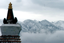 青海湖畔的佛塔與“雪山云!逼嬗^(guān)相映成趣。 本報(bào)記者:侯德強(qiáng) 攝 |