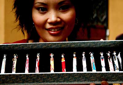 26歲的天津市民李月晴從小就練習(xí)在粉筆上雕刻,至今已制作完成中國古代四大美女、紅樓夢人物、卡通人物等多組粉筆雕刻作品。圖為李月晴展示自己制作的粉筆雕刻作品。