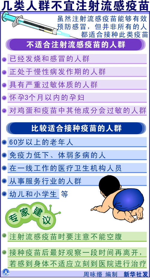 近期我國大部分地區(qū)開始持續(xù)降溫,感冒咳嗽的人不斷增加,專家建議,廣大市民可開始注射流感疫苗,在發(fā)病高峰期冬季來臨之前做好準備。 云南省健康教育專家熊世杰說,流感是由流行性感冒病毒引起的急性呼吸道傳染病,常表現(xiàn)為發(fā)熱、頭痛、肌痛、乏力、鼻炎、咽痛、咳嗽、腸胃不適等,發(fā)病后持續(xù)時間較長,還容易引發(fā)心肌炎、哮喘、肺炎等并發(fā)癥,因此那些本身就患有慢性病和體質(zhì)虛弱的老年人及幼兒尤其需要注意。 記者從昆明市衛(wèi)生防疫站了解到,流感病毒大致分為甲、乙、丙等類型,其中甲型和乙型流感對人類威脅較大。而流感流行具有一定的季節(jié)性,像我國北方地區(qū)的發(fā)病高峰一般在冬季,而南方一般在夏季和冬季,但只要是氣溫急劇下降的時候也會流行。例如這兩天昆明天氣驟然變冷,感冒發(fā)燒的人明顯增多,恢復(fù)起來也要比平時慢。 熊世杰說,流感疫苗注射后,大都會出現(xiàn)流鼻涕、渾身疼痛等癥狀,這表示人體的免疫系統(tǒng)對疫苗起了反應(yīng),持續(xù)幾天后就會好轉(zhuǎn)。此外,注射一次流感疫苗并不代表終生免疫,因為流感病毒的亞型很多,每年流行的流感病毒種類不同,最好每年注射一次,而且必須聽從醫(yī)生建議,有針對性地進行接種。