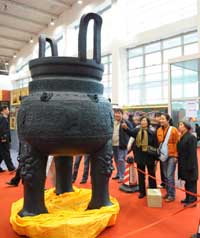 一座“奧運寶鼎”日前在北京舉行的第四屆中國民間工藝品博覽會上亮相。寶鼎高2.66米,厚僅2厘米,重約600公斤,鼎身分別刻有奧運會會徽和奧運會吉祥物福娃,鼎體紋飾和浮雕總計刻有56條中華龍,象征56個民族。