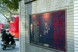 陜西省西安市為進(jìn)一步提升歷史文化品位,弘揚(yáng)中華文化,將西大街規(guī)劃建設(shè)為仿古建筑一條街,與鐘樓、鼓樓和城墻等相呼應(yīng),再現(xiàn)盛唐時(shí)期文化的獨(dú)特魅力。在大力發(fā)展經(jīng)濟(jì)、努力建設(shè)國(guó)際化大都市的同時(shí),西安市積極推動(dòng)社會(huì)主義文化建設(shè),以提高居民的文明素質(zhì),建設(shè)文化小康、精神小康。 西安市街道上的文化海報(bào)。 |