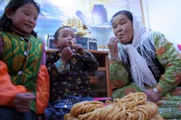 12月2日,甘肅省酒泉市阿克塞哈薩克族自治縣牧民庫麗達熱(右)在定居房內(nèi)和孫子們一起品嘗哈薩克民族食品。 甘肅省酒泉市阿克塞哈薩克族自治縣結合縣城搬遷工程,以牧民定居和高標準小康建設為目標,堅持高起點、高標準、超前意識的原則,統(tǒng)一規(guī)劃,牧民投資,縣、鄉(xiāng)政府補助修建民族新村定居點,實現(xiàn)了水、路、電、閉路電視、電話和天然氣“六通”,F(xiàn)入住牧民494戶1967人,占全縣牧民人口的85%。民族新村的建設改變了以往牧民逐水草而居的游牧生活,提高了生活水平,牧民群眾真正實現(xiàn)了從游牧到定居,從溫飽到小康的歷史性變化,正在向全面的、更高層次的小康目標邁進。 |
