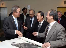 在美國(guó)紐約聯(lián)合國(guó)總部大廈,聯(lián)合國(guó)秘書長(zhǎng)潘基文(左一)向中國(guó)常駐聯(lián)合國(guó)代表王光亞大使(右二)和中國(guó)著名畫家、天津美術(shù)家協(xié)會(huì)副主席王書平(右一)了解中國(guó)畫的創(chuàng)作特點(diǎn)。新華社發(fā)