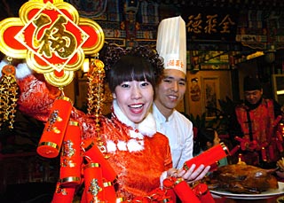 “周年旺相”是“西夏烤羊背”、“一團和氣”是“炸麻團”、“年年高升”是“香煎年糕”……記者采訪中發(fā)現(xiàn),各大酒店飯店為迎合消費者討“口彩”的需要,在菜名上大做文章。什么“恭喜福如!薄凹t運聚寶盆”“發(fā)財好利來”等等菜名,無不透露出喜慶和濃濃的“年味”。