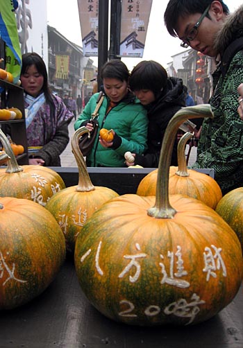 伴隨春節(jié)到來,一些刻上了吉祥語句的小南瓜亮相杭州市河坊街。這些既可以食用又可以當(dāng)作擺設(shè)的小南瓜吸引了很多市民購買。