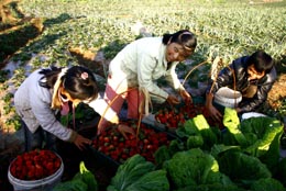 近年來,云南省彌勒縣將發(fā)展冬季特色農(nóng)業(yè)作為新農(nóng)村建設(shè)的首要任務(wù),為農(nóng)民引進優(yōu)良品種,提供技術(shù)指導(dǎo),在彌陽鎮(zhèn)大莊村建立草莓科技示范基地,使異地草莓在這里扎根并獲得豐收,大大增加了農(nóng)民收入。圖為彌勒縣彌陽鎮(zhèn)大莊村村民劉菊珍(中)一家在草莓園將采摘的草莓分級整理。