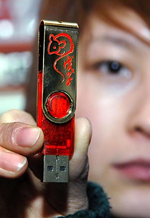 銀川某電腦城日前展示了一款“生肖紀念閃存盤”,傳統(tǒng)與時尚相融合的設計受到年輕消費者青睞。圖片為一名女孩在展示“鼠年U盤”。
