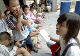 一名社工在給留守兒童們朗誦詩歌。新華社記者:岳月偉