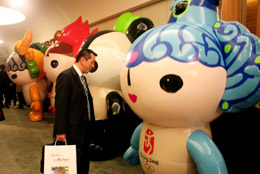 由國(guó)家旅游局牽頭組成的中國(guó)旅游代表團(tuán)日前在日本東京舉辦了以“中國(guó)奧運(yùn)旅游觀光年”為主題的大型中國(guó)觀光推介活動(dòng)。圖為參觀者觀看2008年北京奧運(yùn)會(huì)吉祥物“福娃”。