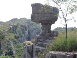 在山東沂蒙山區(qū)的蒙陰縣界牌鎮(zhèn)塌崖山頂峰,有一尊“火炬石”,其狀貌與熊熊燃燒的火炬極其相似,讓人不由不驚嘆大自然的鬼斧神工。 這塊奇石位于界牌鎮(zhèn)南3公里處的塌崖山頂峰,遠看像一個正在燃燒的火炬!盎鹁媸鄙隙酥睆郊s2米,根部直徑僅約0.3米。巨石立于一點,看似搖搖欲墜,但多少年了,歷經(jīng)風霜雪雨的侵蝕而不倒。 據(jù)介紹,“火炬石”周邊區(qū)域已被當?shù)亻_發(fā)成為集民俗、休閑、娛樂、觀光于一體的綜合性生態(tài)旅游區(qū),成為沂蒙山區(qū)旅游的一個新亮點。隨著北京奧運會日益臨近,越來越多的游客到“火炬石”旁邊留影。 地處沂蒙山區(qū)的臨沂市是遠近知名的“中國奇石之鄉(xiāng)”,特別是這個市的費縣境內(nèi),奇石眾多,千姿百態(tài),妙趣橫生。