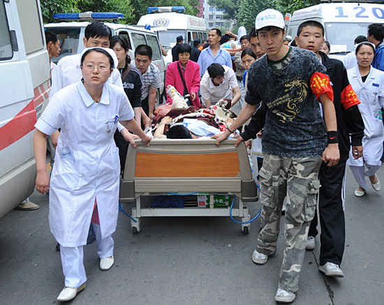 醫(yī)護(hù)人員和志愿者在運(yùn)送傷員。新華社記者 劉海峰