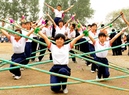 5月27日,“積極推進(jìn)‘陽(yáng)光工程’,促進(jìn)學(xué)生體質(zhì)健康發(fā)展論壇”在長(zhǎng)春開(kāi)幕,此次活動(dòng)的重要內(nèi)容之一是長(zhǎng)春市雙陽(yáng)區(qū)“陽(yáng)光體育”成果展示。圖為長(zhǎng)春市回族中學(xué)的學(xué)生在表演竹竿舞。 |