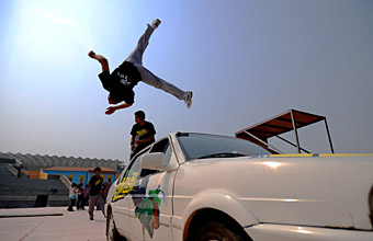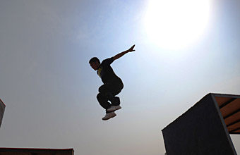 有人把城市的水泥叢林比喻成“死亡墳?zāi)埂,因(yàn)樗拗屏巳祟?lèi)活動(dòng),F(xiàn)如今,許多國(guó)家的城市中活躍著這么一群飛檐走壁的“健兒”,他們把整個(gè)城市視為游樂(lè)場(chǎng):時(shí)而像輕功高手,從兩層樓高的建筑物上瀟灑地跳到地面上;時(shí)而如同蜘蛛俠,手腳“吸”在墻壁上向上爬;時(shí)而又好似忍者,從一幢樓的頂層縱身一躍,跳到毗鄰樓房的頂層…… 他們,就是城市中一個(gè)新興群體——跑酷一族。