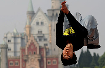 | 來(lái)自中國(guó)跑酷俱樂(lè)部的幾位選手在長(zhǎng)沙世界之窗公園里為觀眾們奉獻(xiàn)了一場(chǎng)跑酷運(yùn)動(dòng)秀,他們通過(guò)嫻熟的奔跑、翻轉(zhuǎn)、跳躍、攀爬動(dòng)作,在各種障礙物間自由穿越,贏得觀眾喝彩。新華社記者
