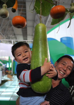 9月4日,小朋友抱著大大的瓜果留影。2008年中國昆明國際花卉展暨昆明國際農(nóng)業(yè)博覽會正在召開,極富特色的無公害、綠色食品亮相,如重達(dá)一百公斤的南瓜、造型特異的絲瓜、精美的辣椒等都受到市民的喜愛。