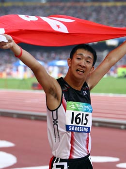 9月15日,中國香港選手蘇樺偉在比賽后慶祝勝利。當日,在國家體育場進行的北京2008年殘奧會男子200米T36級決賽中,蘇樺偉以24秒65的成績奪冠,并打破世界紀錄。