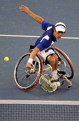 9月15日,日本選手國枝慎吾在比賽中回球。當日,在北京2008年殘奧會輪椅網(wǎng)球男子單打公開級決賽中,國枝慎吾以2比0戰(zhàn)勝荷蘭選手羅賓·阿梅爾蘭,奪得冠軍。