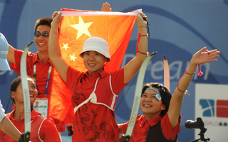 9月15日,中國選手高芳霞(中)、符洪芝(左一)、蕭彥紅(右一)慶祝勝利。當日,在北京2008年殘奧會女子團體反曲弓-公開級決賽中,中國隊戰(zhàn)勝韓國隊,獲得金牌。