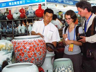 9月16日,在淄博舉行的國際陶瓷博覽會(huì)上,兩名外國參觀者與一名參展商洽談。