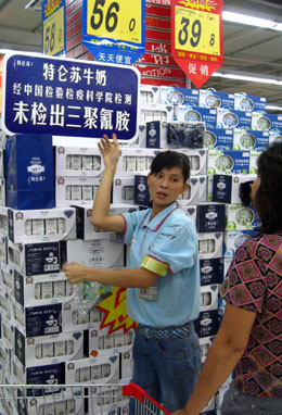 9月24日,在?谀吵,蒙牛牛奶推出優(yōu)惠活動(dòng),并標(biāo)出牛奶不含三聚氰胺的標(biāo)志。目前,蒙牛、伊利等奶制品商家都在?谑懈鞔蟪匈N出公告,承諾目前所售產(chǎn)品已通過檢驗(yàn),市民可放心飲用。鑒于消費(fèi)者對(duì)商品的信心還有待恢復(fù),部分商家積極開展了各類促銷活動(dòng)。