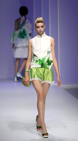 10月5日,模特在法國巴黎2009春夏女裝時裝周上展示“夏姿·陳”(SHIATZY CHEN)新品服裝。當天,中國臺灣服裝品牌“夏姿·陳”首次在巴黎時裝周亮相,并展示了設計師王陳彩霞的近50套春夏女裝新品。該品牌春夏系列以梅青、抹紅與甜白等恬雅的東方色彩為主,并擷取了中國瓷藝的設計靈感,將中國瓷器的瓶身與瓶口輪廓融入剪裁的線條與細節(jié)。