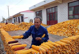10月8日,寧夏石嘴山市惠農(nóng)區(qū)紅果子鎮(zhèn)農(nóng)民高崇喜在晾曬玉米棒。2008年寧夏玉米種植面積225萬畝,預(yù)計產(chǎn)量10億公斤左右。