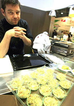 圖片說(shuō)明:一名廚師在二零零八巴黎國(guó)際食品展上展示用山羊奶酪制作的美食。