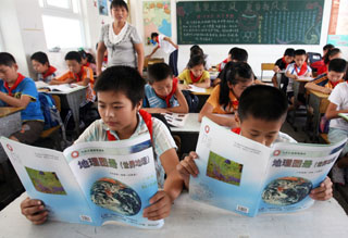 正在舉行的上海市第十三屆人大常委會(huì)第六次會(huì)議上傳出消息,從2008年開(kāi)始,上海實(shí)施義務(wù)教育不僅不收學(xué)費(fèi)和雜費(fèi),同時(shí)也不再收取教科書(shū)費(fèi)和作業(yè)本費(fèi),這一舉措將寫(xiě)入地方法規(guī)。會(huì)議審議了《上海市實(shí)施〈中華人民共和國(guó)義務(wù)教育法〉辦法(修訂草案)》,其中第五條在國(guó)家規(guī)定不收學(xué)費(fèi)和雜費(fèi)的基礎(chǔ)上,增加了免收教科書(shū)費(fèi)、作業(yè)本費(fèi)的內(nèi)容。 圖為上海市普陀區(qū)曹楊小學(xué)的學(xué)生們正在上課。 |