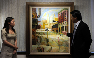 10月20日,佳士得拍賣行的工作人員在介紹畫家朱沅芷的作品《歡樂節(jié)慶的百老匯》。