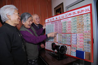 董化銘老人指著展板上的各類票證回憶起往事:“在那個年代,不僅人們收入微薄,而且物資匱乏,一切東西全部都要憑票證,實(shí)行計劃供應(yīng)! 各類票證充斥著人們的生活,糧票、肉票、布票、鹽票、油票、煙票、……就連買糖果、糕點(diǎn)、火柴、肥皂也要憑票,票證漸漸成了城鄉(xiāng)居民吃飽穿暖的一種保障。一個家庭所有生活必需品都離不開各種票證,在當(dāng)時誰家要是把票證丟失了,就意味著這個月可能沒有肉吃沒有衣穿了。 一個好的當(dāng)家人不僅要計算著每月幾十元工資如何養(yǎng)活一家數(shù)口人,還要精打細(xì)算精心管理如何使用一個月內(nèi)各種票證,每人每月供應(yīng)三兩油,根本就不夠吃,每日飯菜很少吃到油香味,所以家里買肉時都挑肥的。當(dāng)年的米面約0.15元一斤,豬肉約0.74元一斤,都得憑票購買,那時候的人們都是‘等米下鍋’,只等票兒一到手,迫不及待就要去買米,沒有票,人們拿錢也買不到這些東西。老人說,家里至今仍保存著的一臺燕牌縫紉機(jī)就是憑當(dāng)年的票證買的。 董化銘老人還告訴記者:“之所以現(xiàn)在還能留下這么多糧票,并不是因?yàn)楫?dāng)年家里富余吃不完,而是因?yàn)檫^去糧食少,經(jīng)常有票也買不上,所以這些糧票才會剩在手里。”
