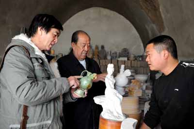 近年來(lái),一些致力于草原游牧民族陶瓷藝術(shù)的收藏迷紛至沓來(lái),在黃土丘陵山坳間的古窯附近訪古“探寶”、揀拾瓷片,為這片荒涼破敗的陶瓷老作坊帶來(lái)些許生機(jī)。圖為來(lái)自呼和浩特市的陶瓷藝術(shù)收藏家李大龍(左一)與藏友探討鮮卑族陶瓷制作藝術(shù)。