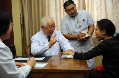 11月28日,北京醫(yī)院中醫(yī)科主任、90歲的著名老中醫(yī)李輔仁(左一)在為患者診病。據(jù)介紹,北京醫(yī)院中醫(yī)科涌現(xiàn)出新一批名中醫(yī)和中西醫(yī)結(jié)合專家,每年診治患者約10萬人次。新華社記者:李曉果