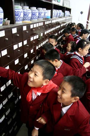 中醫(yī)學(xué)者建議在中小學(xué)教材中加入中醫(yī)藥常識(shí)專題,以加大中醫(yī)知識(shí)普及力度。圖為安徽小學(xué)生參觀中藥房。程千俊