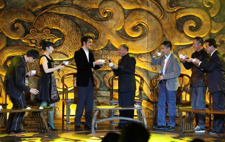 1月4日,在北京舉行的電影《赤壁》(下)首映式上,演員趙薇(左二)、金城武(左三)、梁朝偉(右三)等部分電影主創(chuàng)人員向導演吳宇森(中)敬茶。新華社發(fā)(韓源 攝)
