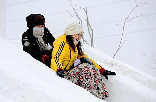 圖為游客在沈陽棋盤山冰雪大世界體驗雪滑梯。