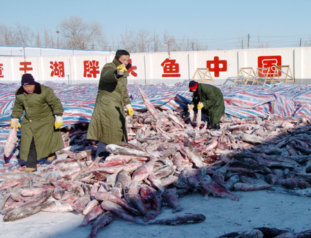 14日,吉林省查干湖漁場(chǎng)到庫(kù)房里里擺滿了剛剛捕上來(lái)到魚,很多游客驅(qū)車到這里購(gòu)買鮮魚。數(shù)九隆冬,吉林省查干湖又迎來(lái)了冬季捕魚的黃金時(shí)節(jié)。隨著當(dāng)?shù)芈糜螛I(yè)的發(fā)展,查干湖漁業(yè)資源也得到有效開發(fā),很多游人頂風(fēng)冒雪跑到冰冷的湖面上爭(zhēng)睹萬(wàn)魚躍網(wǎng)的壯觀場(chǎng)面。日前,吉林省查干湖冬捕以單網(wǎng)出魚量16.8萬(wàn)公斤,打破了2006年創(chuàng)下的10.45萬(wàn)公斤的單網(wǎng)產(chǎn)量的世界紀(jì)錄,創(chuàng)造了新的單網(wǎng)冰下捕撈量最高的吉尼斯世界紀(jì)錄。 14日,查干湖漁場(chǎng)職工正在為鮮魚分類。 |
