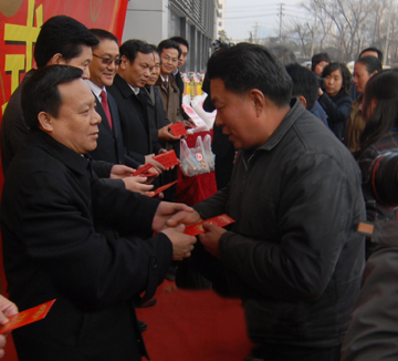 14日,武漢市啟動“2009慈善情暖江城”行動,2400戶特殊困難群體(因雪災(zāi)房屋全倒戶、低保邊緣家庭、農(nóng)民工家庭、因大病致貧家庭等)獲得物資救助。武漢市委常委、副市長胡緒鹍(左)為困難群眾發(fā)“紅包”。