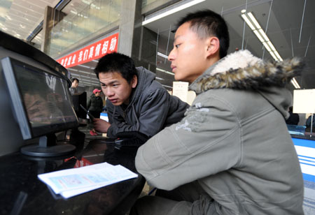 1月14日。兩位求職者通過電子顯示器查看招聘信息。 1月14日,長沙市就業(yè)援助周活動專場招聘會在長沙市人力資源服務(wù)中心舉行。這一場專門針對經(jīng)認(rèn)定的就業(yè)困難人員、“零就業(yè)家庭”成員、城鎮(zhèn)新登記失業(yè)人員的招聘會,吸引了80家用人單位為就業(yè)困難群體提供2000來個崗位。長沙市人力資源服務(wù)中心在現(xiàn)場設(shè)立“就業(yè)困難人員服務(wù)窗口”,為就業(yè)援助對象免費(fèi)提供職業(yè)指導(dǎo)、素質(zhì)測評、創(chuàng)業(yè)指導(dǎo)服務(wù)、勞動保障政策咨詢等“一站式”服務(wù)。 |