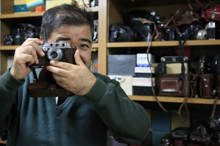 在位于東京偏北部的家中,河野手持其鐘愛的上海58相機(jī)。新華社記者:任正來