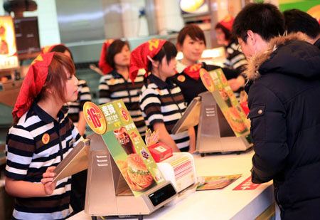 2月4日,麥當(dāng)勞(中國(guó))有限公司在上海宣布,將在全國(guó)范圍的餐廳推出16.5元“天天超值套餐”。據(jù)稱(chēng),該系列套餐的價(jià)格優(yōu)惠高達(dá)32.6%。此舉顯示洋快餐巨頭為刺激銷(xiāo)量增長(zhǎng),以“超值套餐”的促銷(xiāo)方式調(diào)低產(chǎn)品的實(shí)際售價(jià)。圖為顧客在上海一麥當(dāng)勞餐廳內(nèi)購(gòu)買(mǎi)食品。