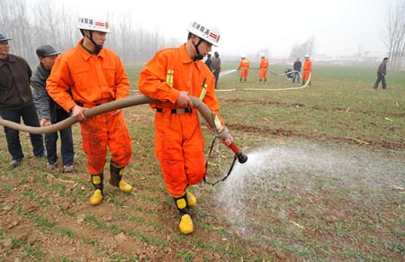河南省委省政府日前通知,要求河南消防總隊(duì)奔赴抗旱第一線。洛陽市消防支隊(duì)按照總隊(duì)指示精神,每天出動(dòng)38輛車,調(diào)配警力1600余人次,運(yùn)水2700余噸,670余畝農(nóng)田得到噴灌。