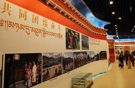 在云南省迪慶藏族自治州香格里拉縣,有一座在全國(guó)藏區(qū)獨(dú)具特色的紅軍長(zhǎng)征博物館。該博物館重現(xiàn)了1936年4、5月間中國(guó)工農(nóng)紅軍長(zhǎng)征途經(jīng)迪慶時(shí)的感人場(chǎng)景及70多年來(lái)雪域高原發(fā)生的巨大變化。目前該博物館已經(jīng)成為迪慶藏區(qū)的愛(ài)國(guó)主義和革命傳統(tǒng)教育基地,每年吸引近10萬(wàn)名中外游客和當(dāng)?shù)厝罕娗皝?lái)參觀,成為香格里拉旅游的新亮點(diǎn)。這是一些游客在云南省迪慶藏族自治州香格里拉縣的紅軍長(zhǎng)征博物館內(nèi)參觀。 |