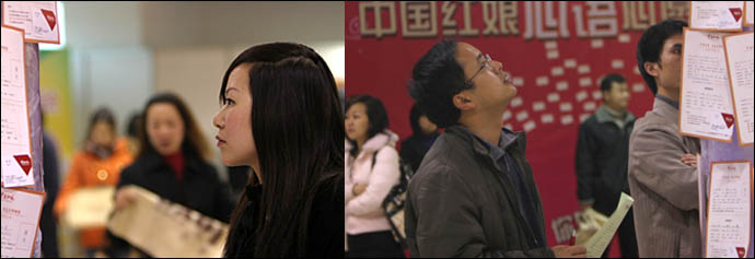 2月21日,中國紅娘(首屆)網(wǎng)絡交友節(jié)在杭州舉辦,活動當天吸引了不少單身男女。舉辦方“中國紅娘”網(wǎng)站為參加活動的單身男女策劃了各種活動和游戲,為他們提供相互了解、接觸的平臺。參加活動的以30歲左右單身男女居多,且多為上班族。有人抱著放松心情的目的,也有人來碰碰運氣,還有人懷著美好的愿望,希望找到自己的另一半。 活動開始后,有些人比較靦腆,不是在桌子旁干坐著,就是跑到后面去看墻上貼的別人的信息。在現(xiàn)場音樂以及主持人的帶動下,一些人逐漸放開了自己,加入到活動中來。在傳遞愛心的活動中,一位男士還在臺上引吭高歌,另一個游戲則要求男士只能動嘴巴和眼睛,由女士喂他們吃東西,這也吸引了好幾組人參加,現(xiàn)場笑聲不斷。不太愛說話的盛先生這次也有所收獲,他要到了幾位女士的聯(lián)系方式,準備活動后聯(lián)系。 三十來歲的阿戴,是中國紅娘網(wǎng)的注冊會員,聽說要舉辦網(wǎng)絡相親會,她也來到現(xiàn)場,準備找一個跟自己學歷、年齡、背景相當?shù)娜,可是今天她并沒有找到自己心儀的人,準備繼續(xù)留意網(wǎng)上的信息。 從事外貿(mào)行業(yè)的謝先生,第一次參加這樣的網(wǎng)絡相親會,不過他對網(wǎng)絡交友可不陌生,他經(jīng)常在網(wǎng)上發(fā)布資料結交朋友。