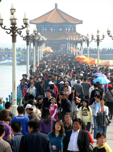 清明節(jié)小長(zhǎng)假期間,沉寂一冬的青島海濱游迅速升溫,沿海各景點(diǎn)游客日接待量在10萬人次以上。圖為游客在青島棧橋景區(qū)游玩。