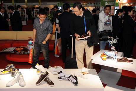 4月19日,海內外客商在鞋類成品館參觀。 當日,第十一屆中國(晉江)國際鞋業(yè)博覽會在福建省晉江市開幕。本屆鞋博會設立鞋機、鞋材、鞋類成品館三大展區(qū)和1350個國際標準展位,吸引來自16個國家和地區(qū)的海內外專業(yè)買家前來洽談訂貨。