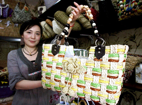 5月4日,蘇州市景德路旁一家草編工藝商店的工作人員展示一款草編女包。立夏將至,蘇州市場上推出的清涼又環(huán)保的草編女包深受女性顧客青睞。新華社發(fā)