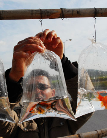 5月9日,在阿爾及利亞首都阿爾及爾街頭,一名攤主出售從中國進(jìn)口的小金魚。近來,阿爾及爾街頭不少地方開始出售從中國進(jìn)口的小金魚,水中游弋的小金魚為北非阿爾及爾增添了一絲清涼和趣意,受到當(dāng)?shù)鼐用竦南矏。新華社記者