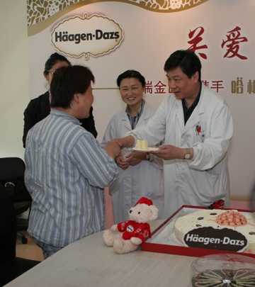 日前,哈根達(dá)斯攜手上海市瑞金醫(yī)院共同開(kāi)展了“關(guān)愛(ài)·守護(hù)——乳腺癌的預(yù)防與保健”活動(dòng),以甜蜜的愛(ài)呵護(hù)媽媽們的健康。圖為瑞金醫(yī)院院長(zhǎng)袁克儉為乳腺癌患者送祝福。